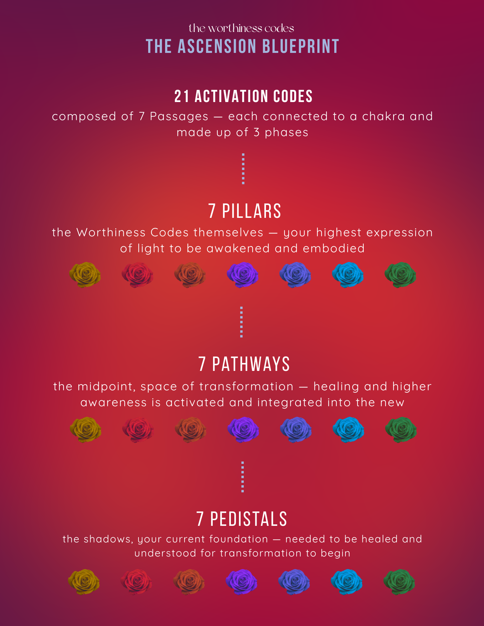 A 21-point ascension blueprint for soul level transformation. Focused within the chakra system, it guides you through 7 Passages, each containing 3 stages: