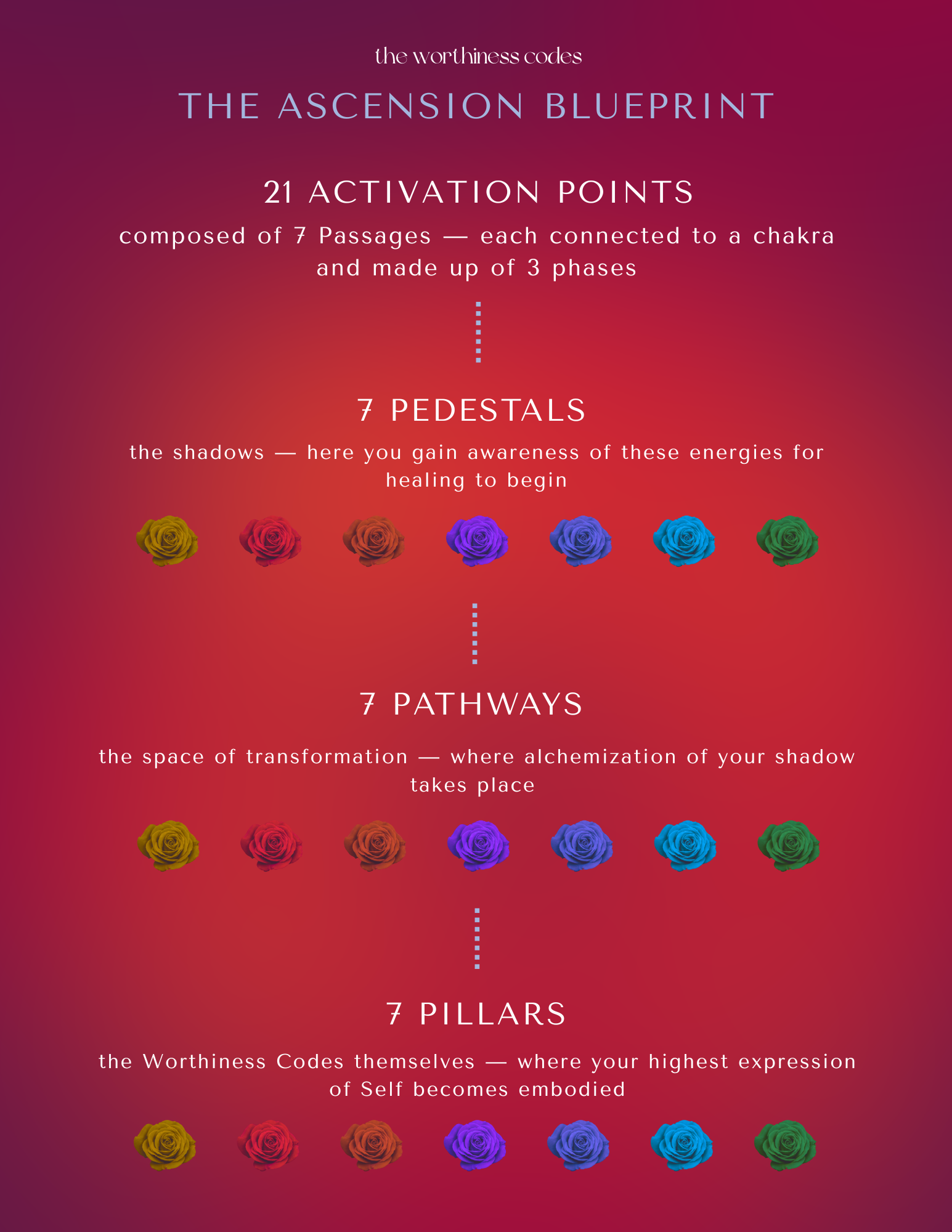 An ascension blueprint holding 21 — activation points for soul level transformation. Focused within the chakra system, it guides you through 7 Passages, each containing 3 phases: